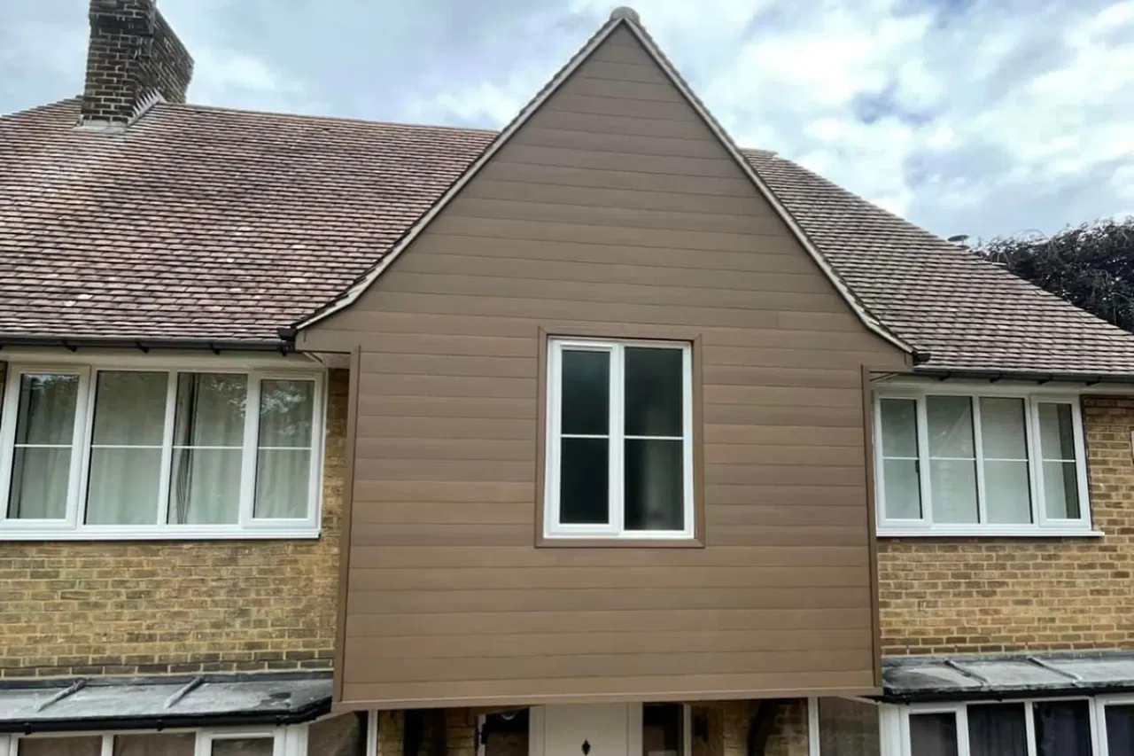 The selected material was Walnut Sentinel composite cladding, chosen for its warm, earthy tones that beautifully complement the house’s brickwork. The project covered both the front elevation and the area above the porch to create a unified appearance.