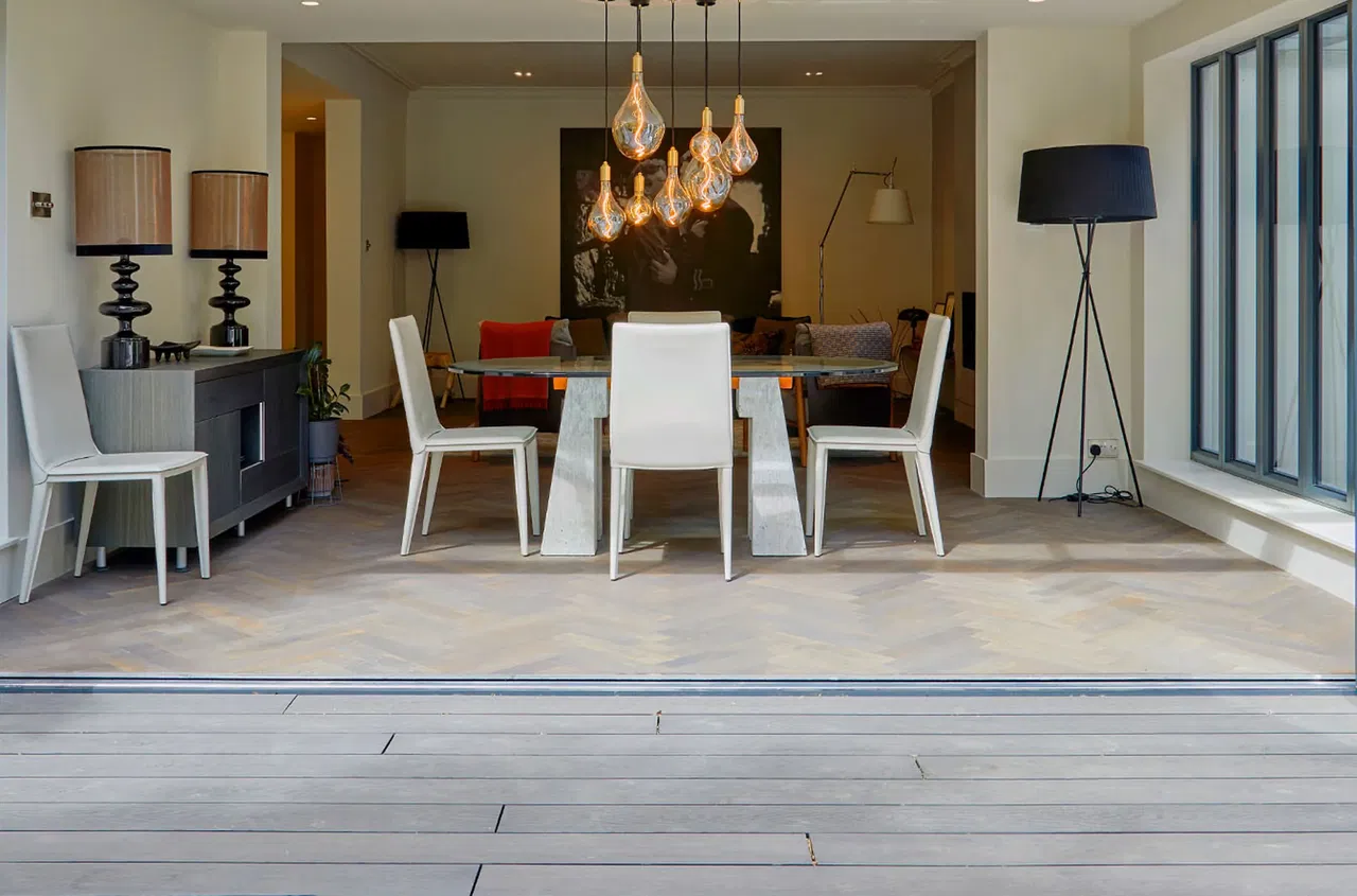 For this North London home, the brief was to unify both the garden area and rooftop terrace under a modern, light aesthetic. Silver Birch Pioneer boards were selected for the garden for their gentle, neutral tones, while Marble Frontier boards were used on the roof terrace. This dual-tone approach allowed for visual harmony across different elevations, accentuating the contemporary architecture and creating seamless transitions between indoor and outdoor spaces.