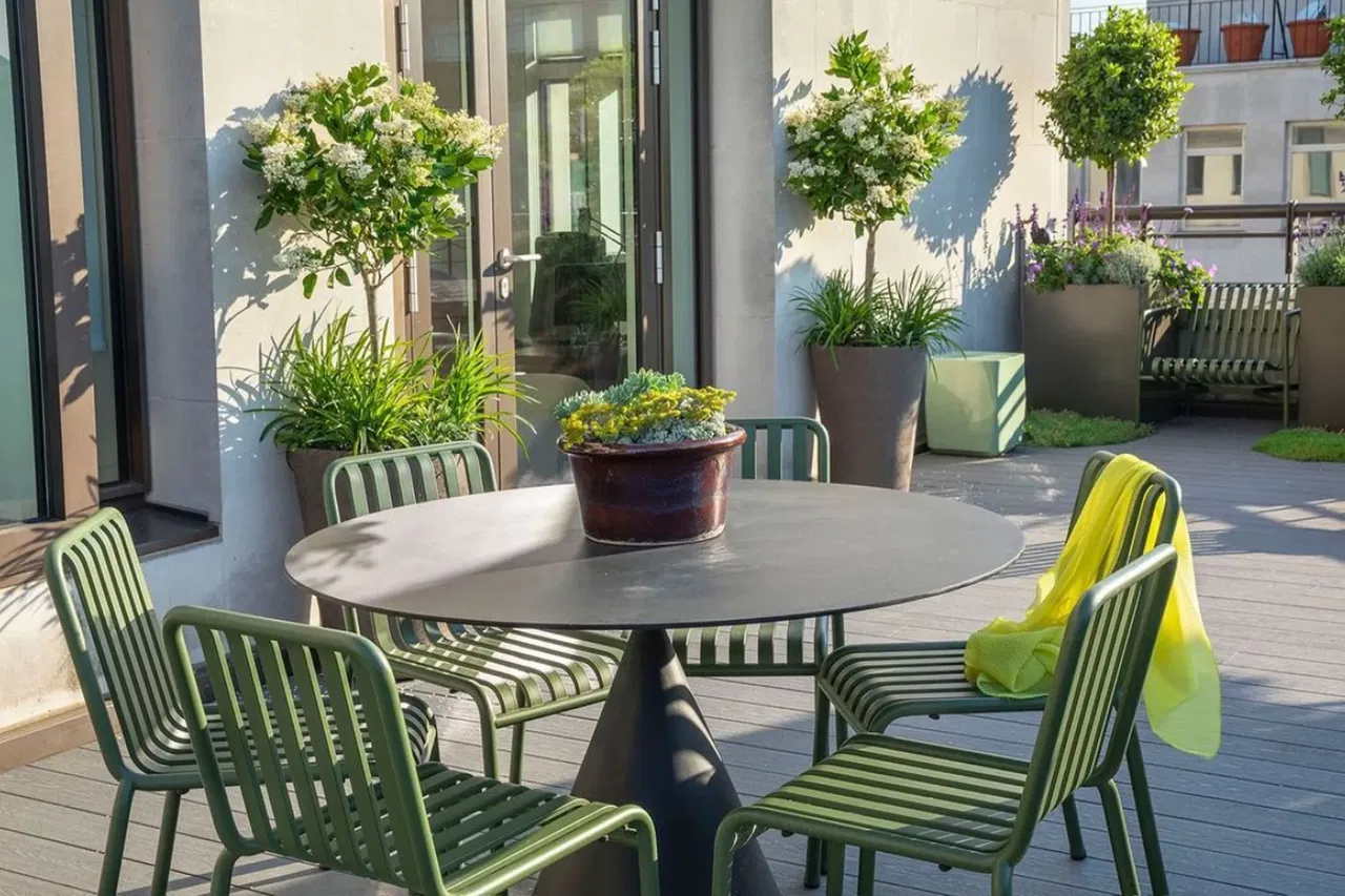 Redesigning a rooftop terrace into a serene communal retreat with stone composite decking, lush planting and elegant grey tones.