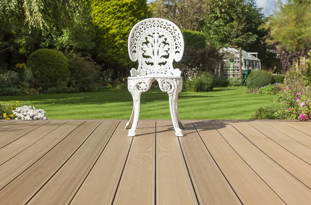 Building a peaceful outdoor dining and relaxation platform with Oak Hyperion decking, walnut border accents and a recycled plastic substructure.