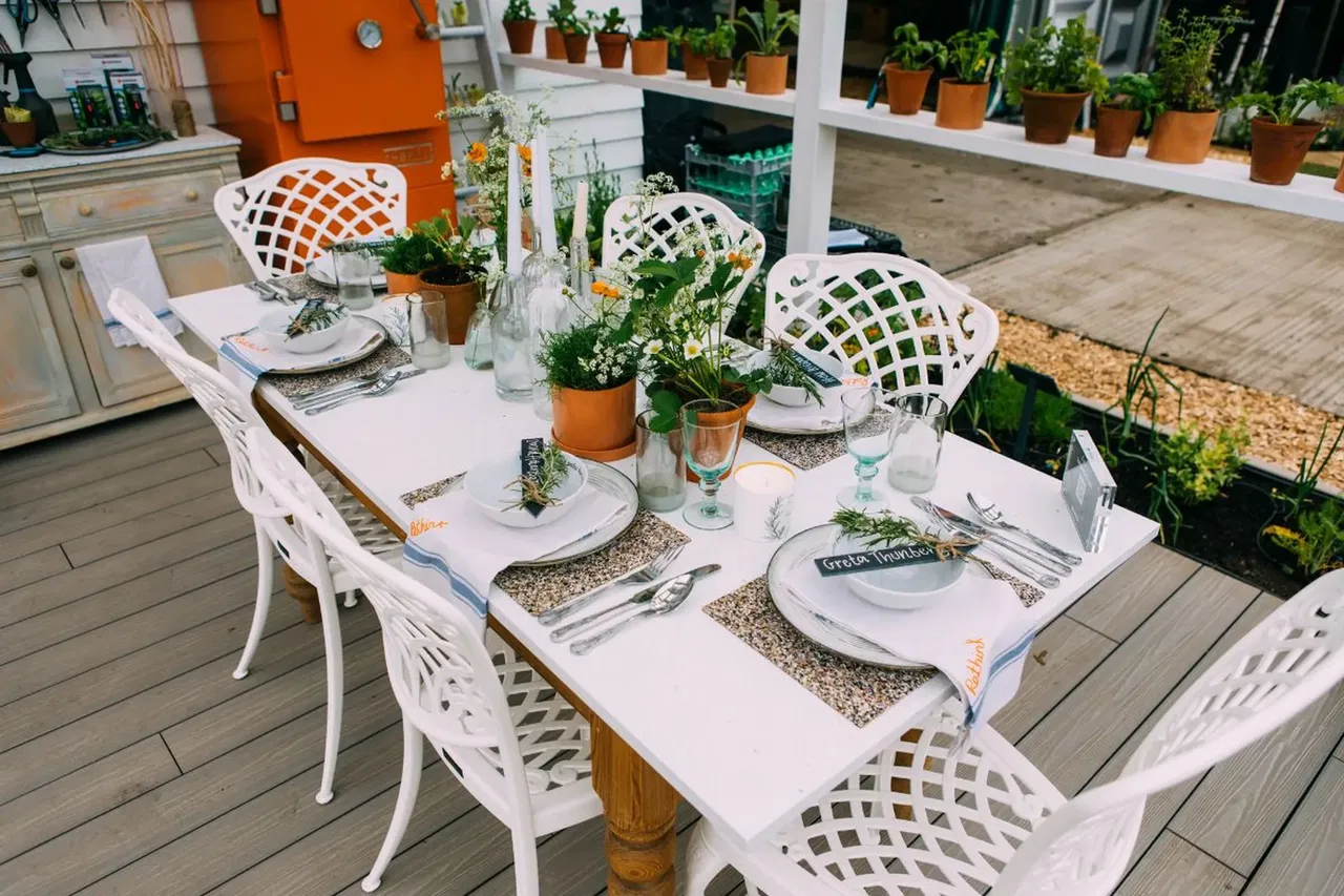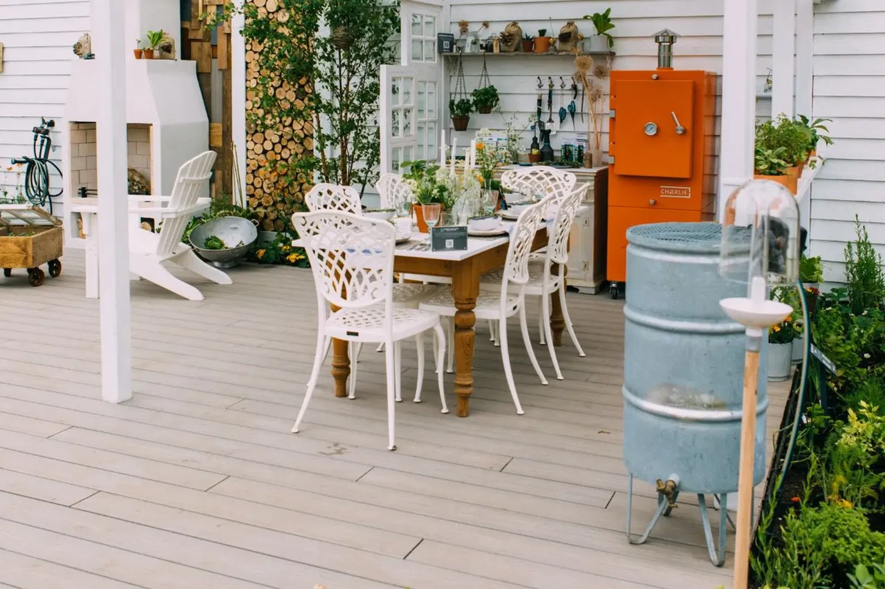 Lynne wanted a flooring solution that was both visually elegant and low maintenance, aligning with her ethos of sustainable design. She chose Silver Birch Explorer composite decking for its clean, light tones, its high recycled content and its compatibility with her vision of bright garden accents and white furniture. The boards integrate effortlessly, giving a refined base to contrast with lush planting and salvaged architectural elements.
