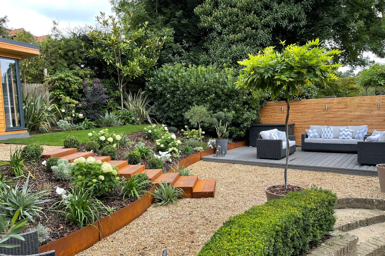 EnviroBuild’s Hyperion Stone Explorer composite decking was specified for the raised seating area, made from 87% recycled materials and delivering a 64% lower carbon footprint than timber. Its natural wood-textured grain integrates with the scheme, while the grey stone colour contrasts with Corten steel details to create a stylish, sunlit place to relax and entertain.