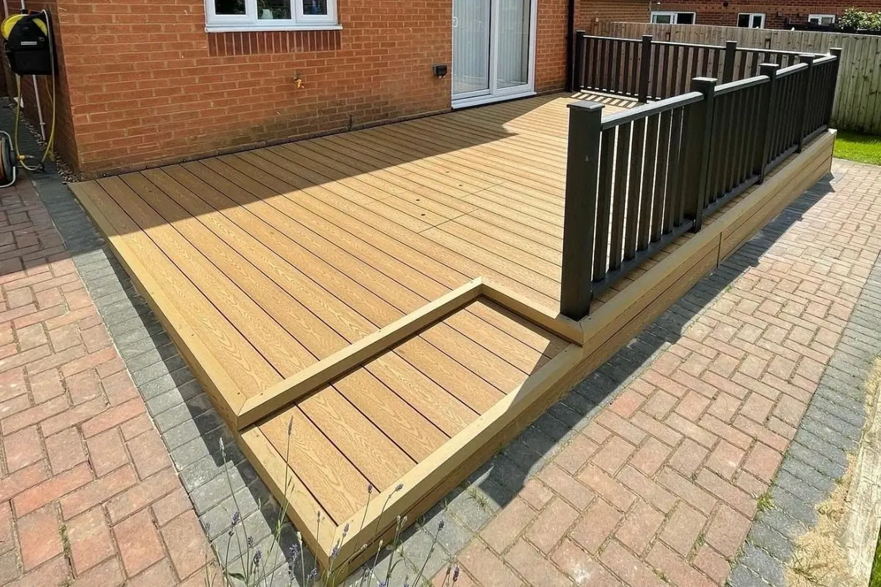 Hyperion Pioneer Oak composite decking was specified for its durability and resistance to rot and warping. The installation used matching trims and hidden fixings for a clean finish, delivering a modern, stable patio that will perform for years with minimal maintenance.