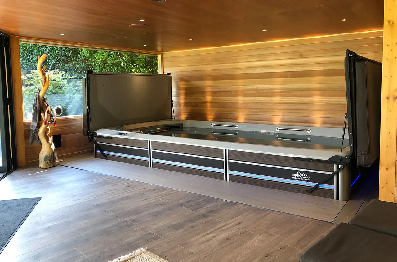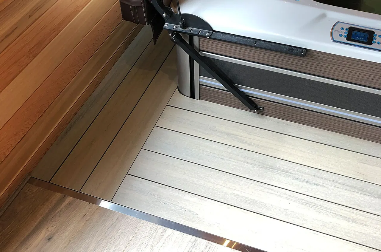 A tailored flooring solution combining composite decking and laminate flooring for a high-performance pool house.