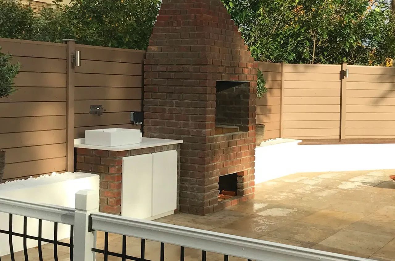 Creating a stylish, low-maintenance outdoor kitchen patio area with Walnut Pioneer fencing atop a raised wall.